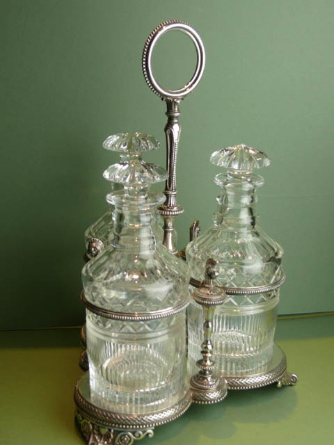 SILVER THREE BOTTLE DECANTER STAND WITH THREE CUT GLASS DECANTERS