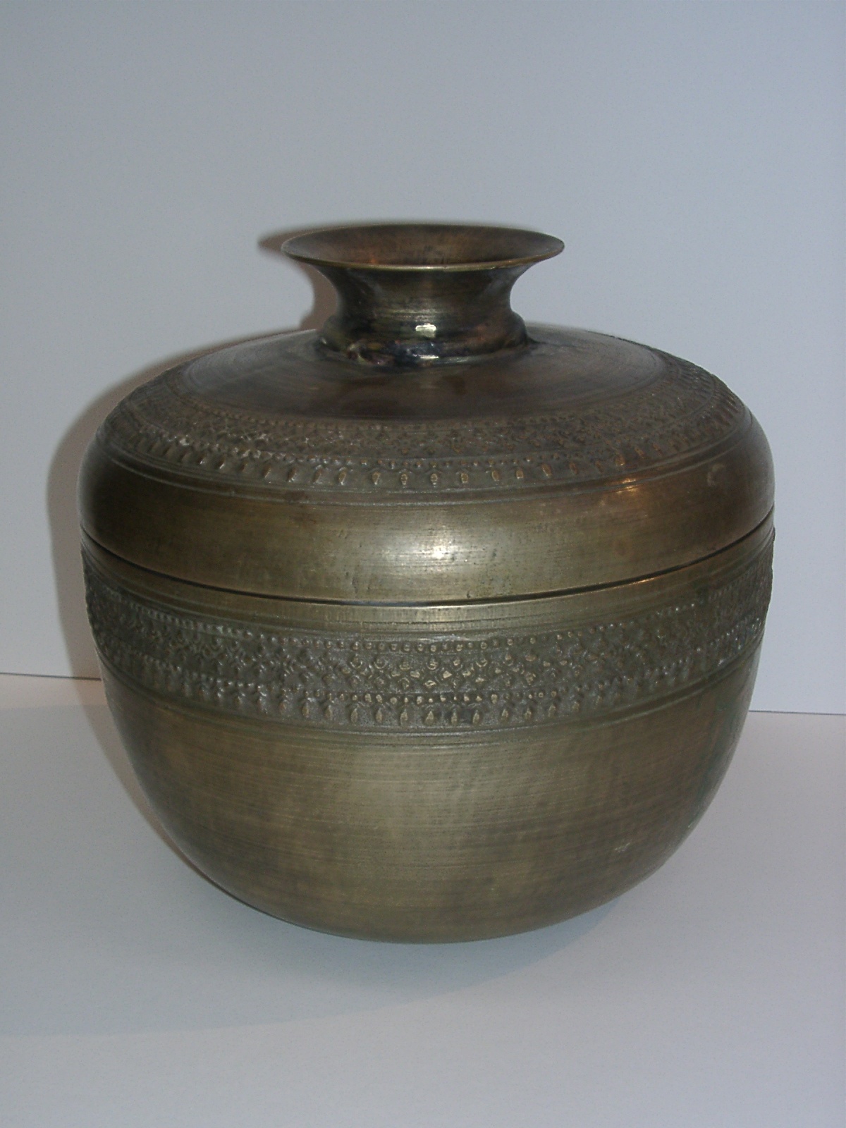 SIMPLE BRASS SPHERICAL SHAPED VASE AND LID WITH RELIEF BRASS CENTRAL BAND 10/i HIGH