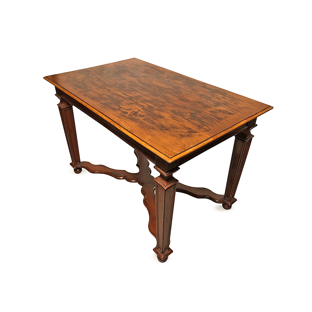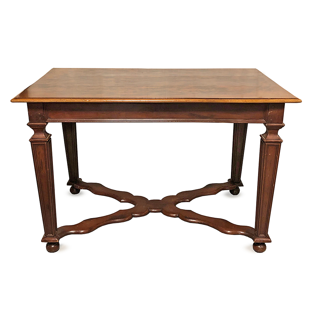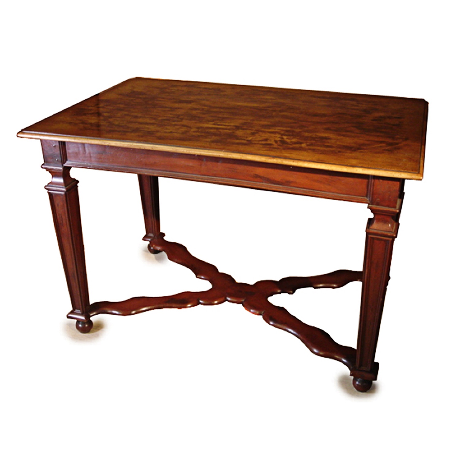 SIMPLE FRENCH WALNUT CENTRE TABLE WITH TAPERING LEGS AND SHAPED X STRETCHER 126 CM LONG 79 CM WIDE 82 CM HIGH