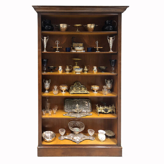 SIMPLE MAHOGANY OPEN BOOKCASE / SHELVES 7' HIGH 4'6/i WIDE (X7)
