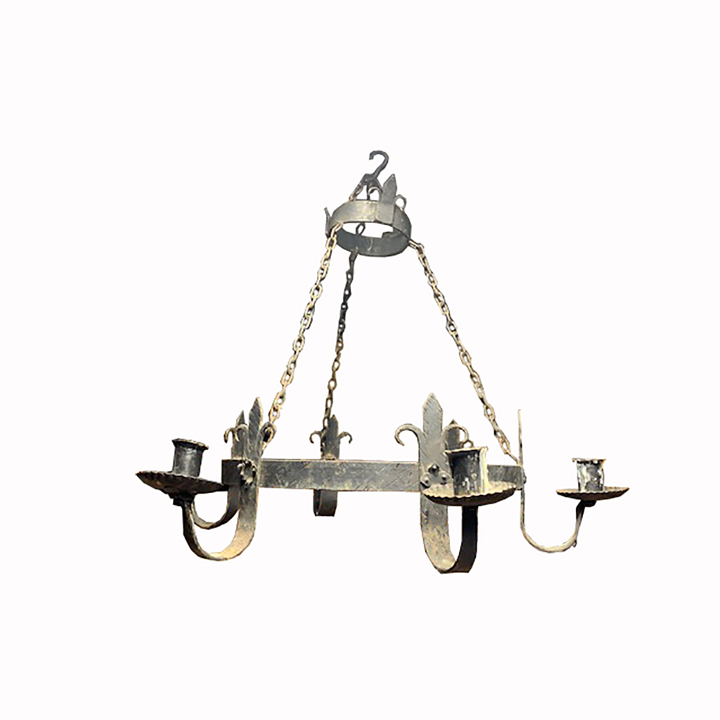 SIMPLE WROUGHT IRON CHANDELIER WITH SIX FLEUR DE LYS BRANCH CANDLEHOLDERS