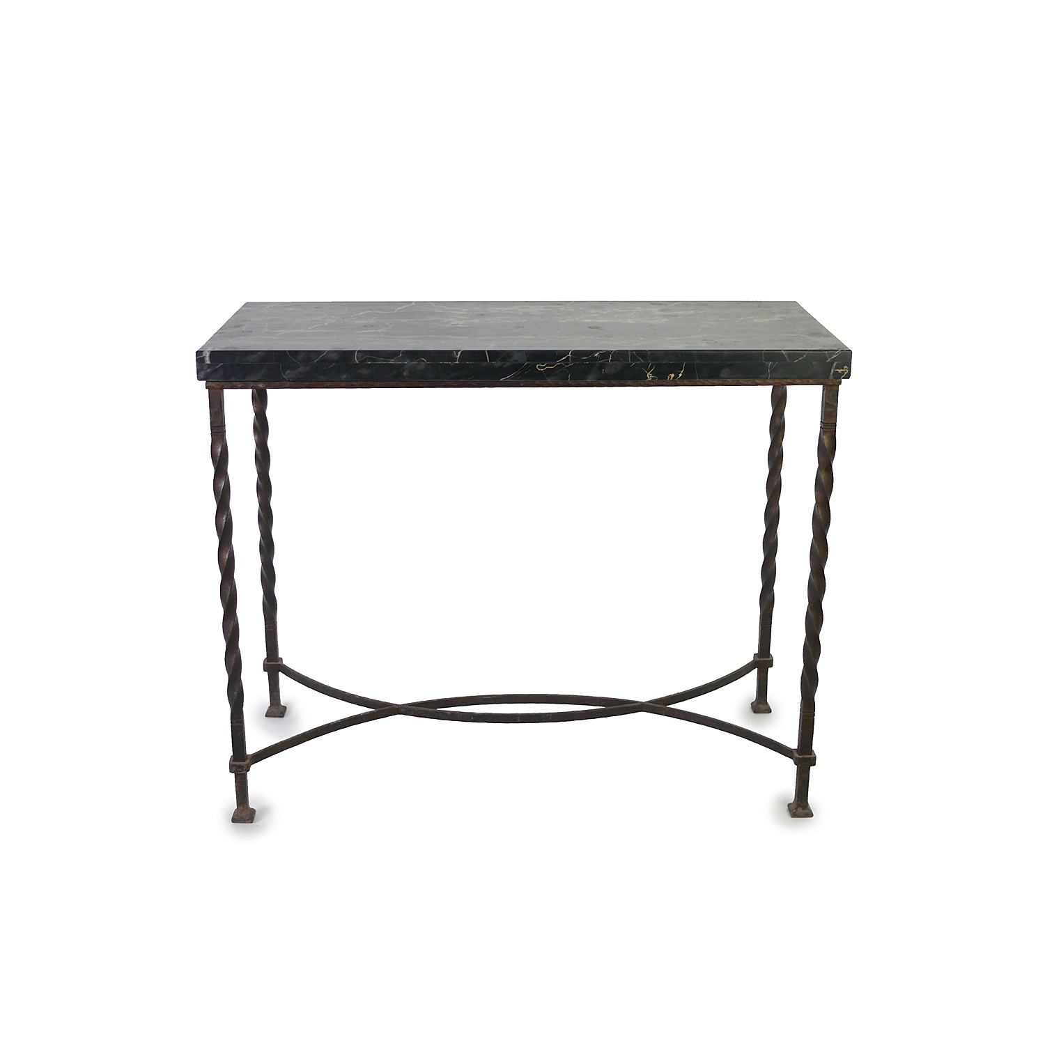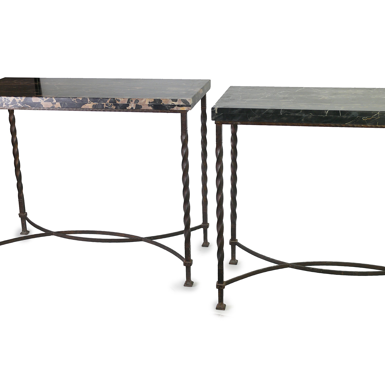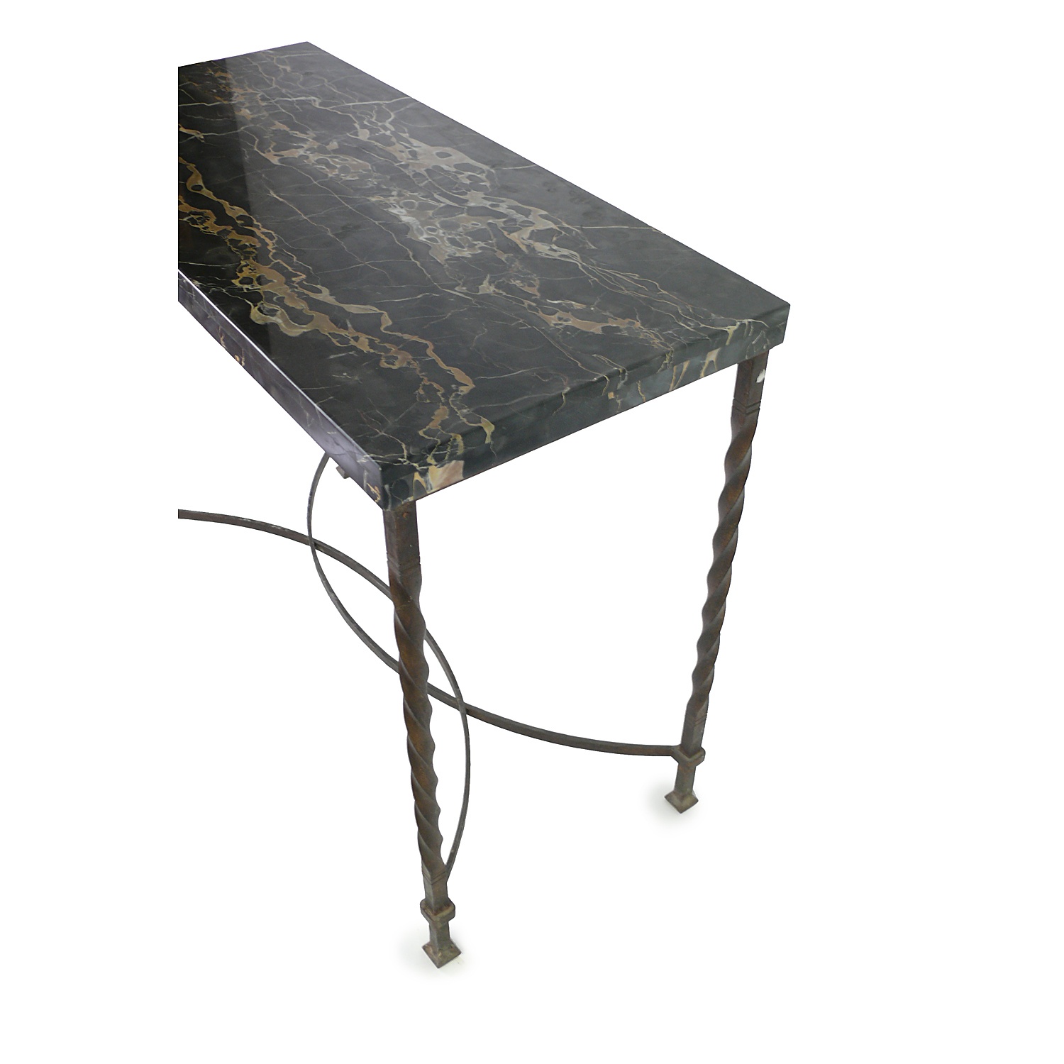 SIMPLE WROUGHT IRON CONSOLE / SIDE TABLE WITH BLACK SAINT LAURENT MARBLE TOP FRENCH 20TH CENT 75 CM HIGH 91 CM WIDE 42 CM DEEP (X2)