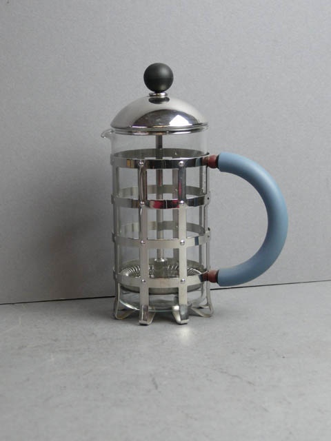 SMALL ALESSI CAFFETIERE COFFEE POT CHROME WITH BLUE HANDLE 18 CM