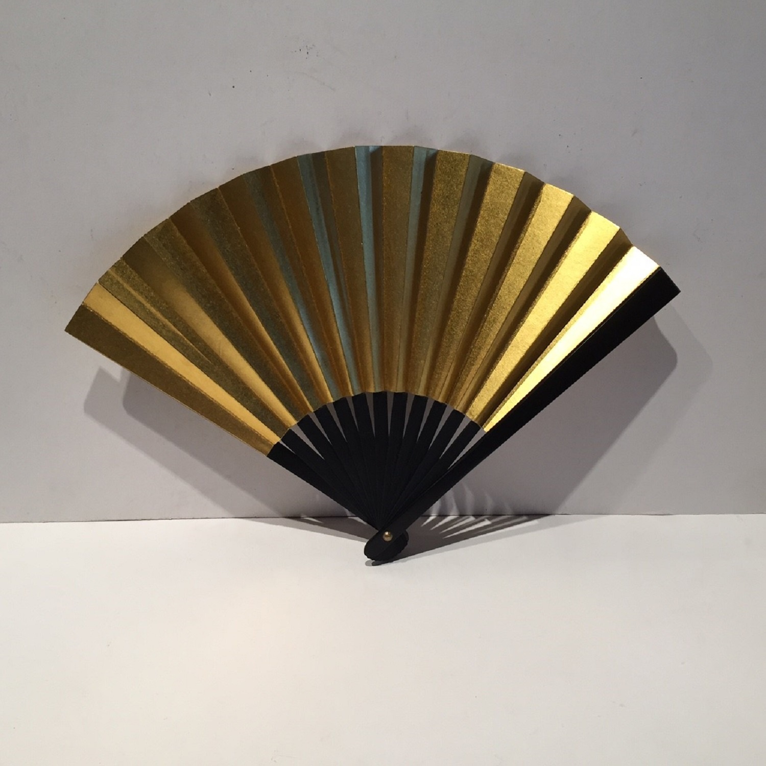 SMALL BLACK ORIENTAL GOLD FAN WITH HEAVY BLACK LACQUERED METAL AND WOOD STICKS