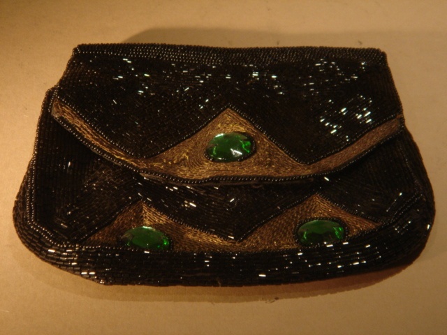 SMALL BLACK SEQUINED CLUTCH HANDBAG WITH GREEN JEWEL ENCRUSTED FLAP 16 CM WIDE