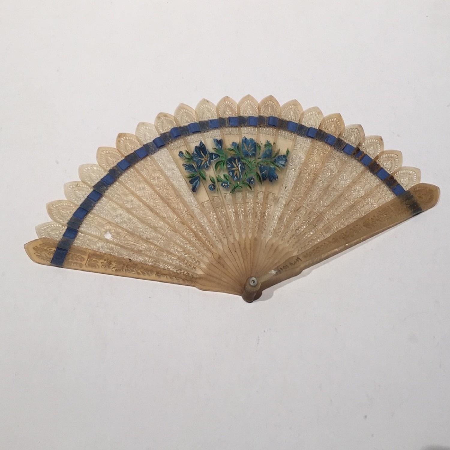 SMALL BLOND TORTOISESHELL PIERCED FAN WITH PAINTED DETAILS AND BLUE RIBBON