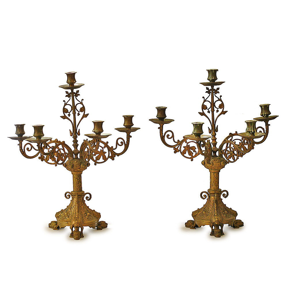 SMALL BRASS GOTHIC STYLE CANDELABRA FIVE LIGHT 48 CM HIGH 40 CM WIDE (X2)