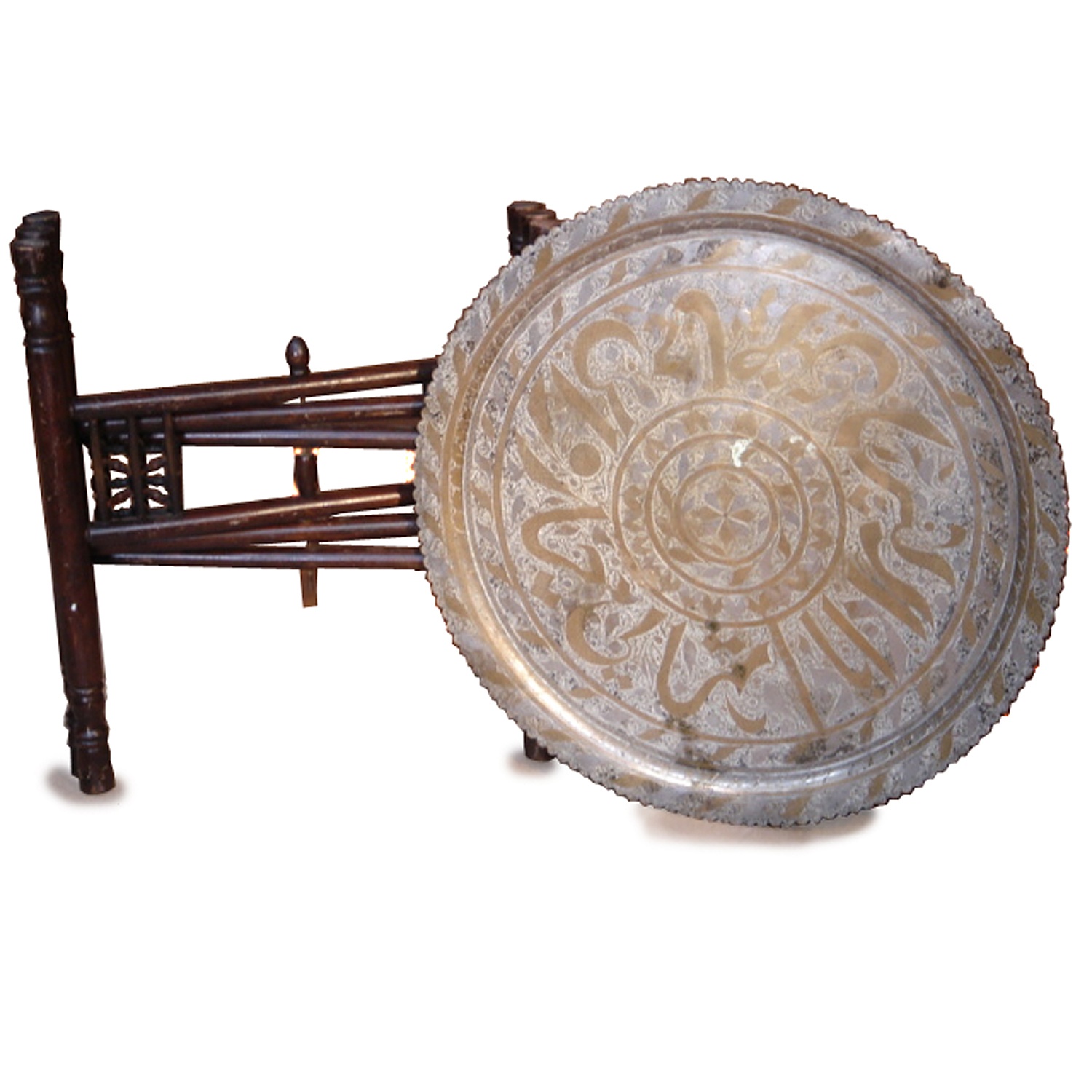 SMALL BRASS INDIAN CIRCULAR TRAY TABLE INC. WOOD BASE 58 CM HIGH 60 CM DIAM