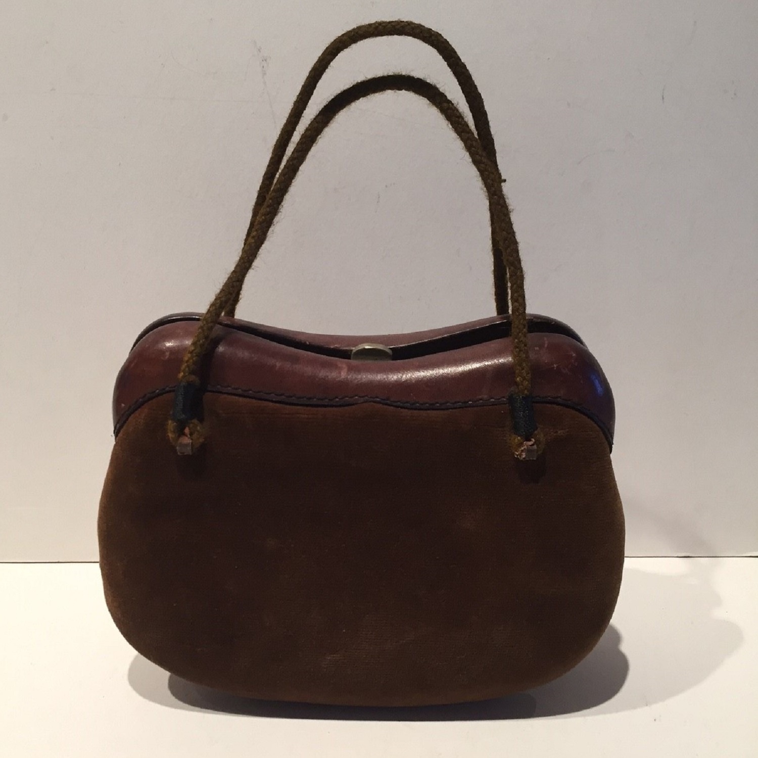 SMALL BROWN SUEDE HAND BAG WITH LEATHER TRIM AND CORD HANDLES AND BRASS CLASP