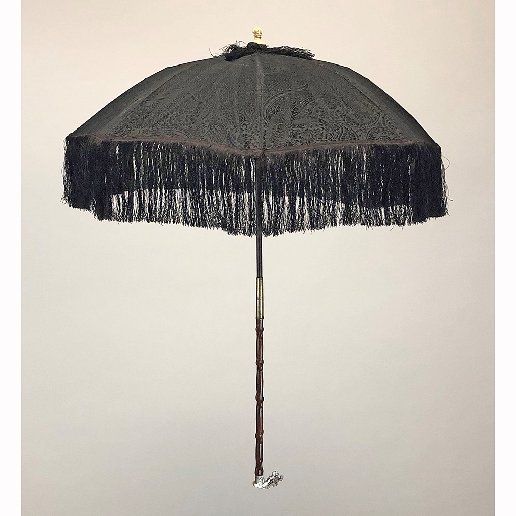 SMALL / CARRIAGE PARASOL WITH WOODEN STEM AND MOTHER OF PEARL HANDLE WITH BLACK WOVEN SILK DAMASK COVER AND FRINGE