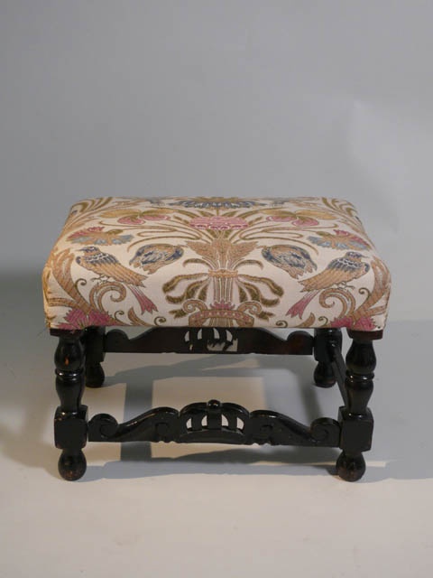 SMALL CHARLES I STYLE EBONY STOOL WITH FLORAL BROCADE UPHOLSTERY