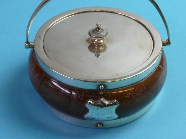 SMALL COASTER BOX WITH LID OAK AND SILVER MOUNTED BARREL DESIGN