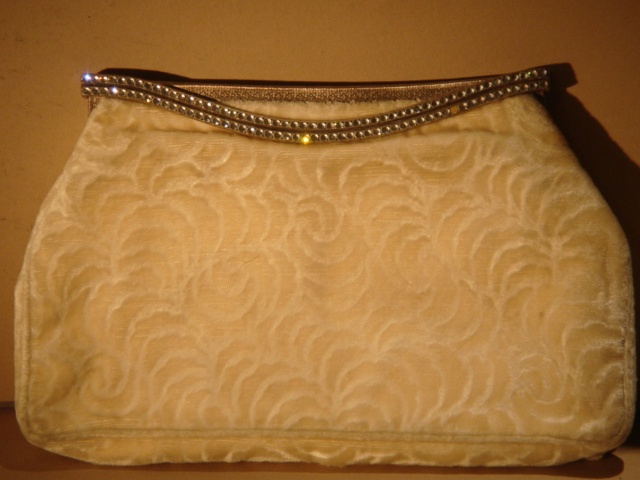 SMALL CREAM CHENILLE CLUTCH HANDBAG WITH DIAMANTE STRAP 22 CM WIDE