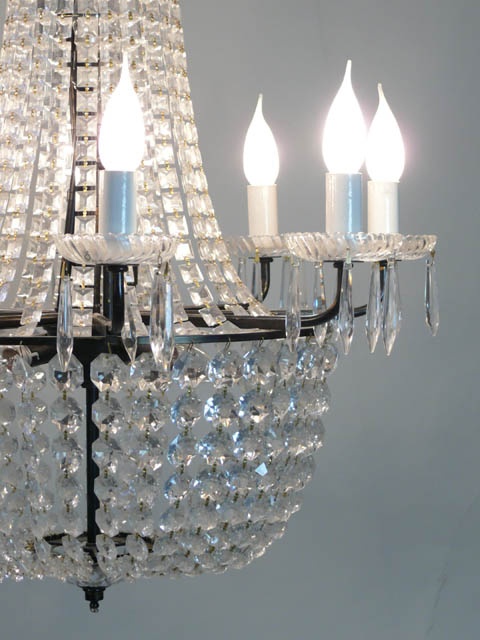 SMALL CRYSTAL BAG CHANDELIER EMPIRE STYLE WITH EIGHT BLACK IRON ARMS 2' WIDE X 3'5/i HIGH 61 CM 104 CM 13 KG