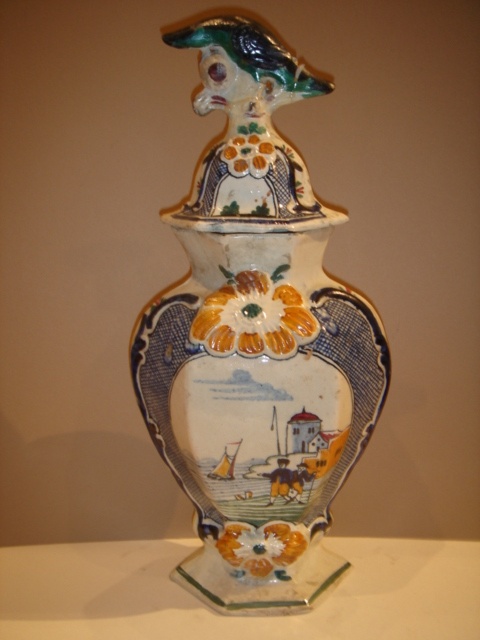 SMALL DUTCH DELFT BLUE AND WHITE HEXAGONAL VASE AND LID 16/i HIGH (X2)