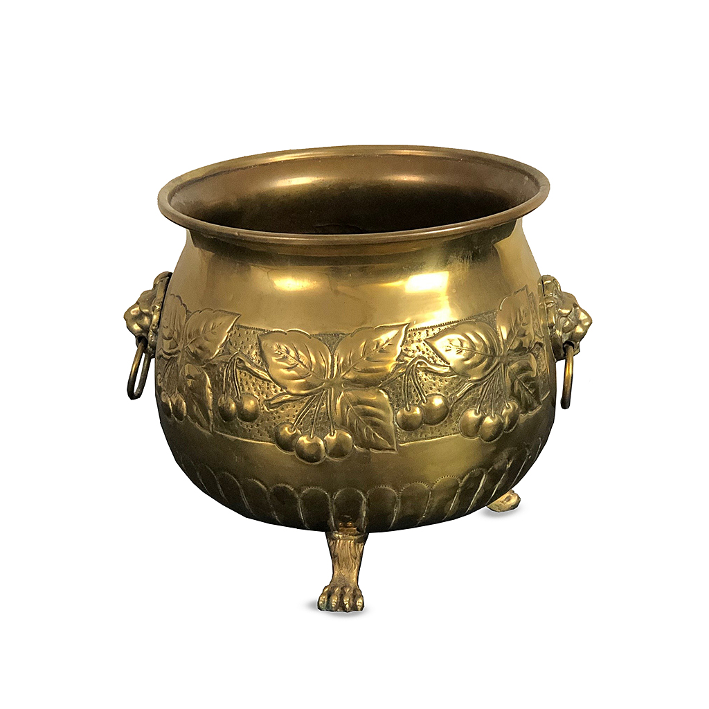 SMALL EMBOSSED BRASS GEORGIAN JARDINIERE WITH LION RING HANDLES AND THREE PAW FEET 25 CM HIGH 29 CM DIAM