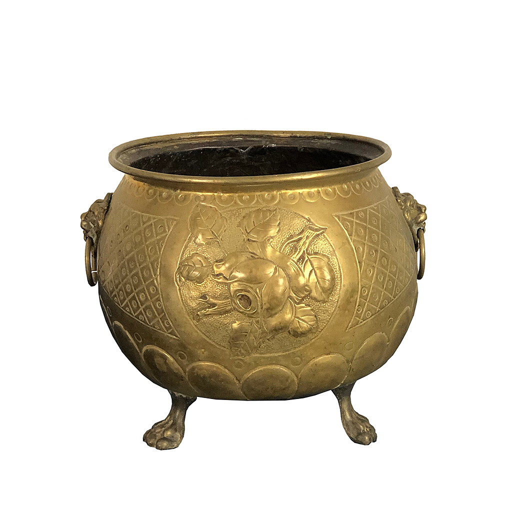 SMALL EMBOSSED BRASS GEORGIAN JARDINIERE WITH LION RING HANDLES AND THREE PAW FEET 25 CM HIGH 30 CM DIAM
