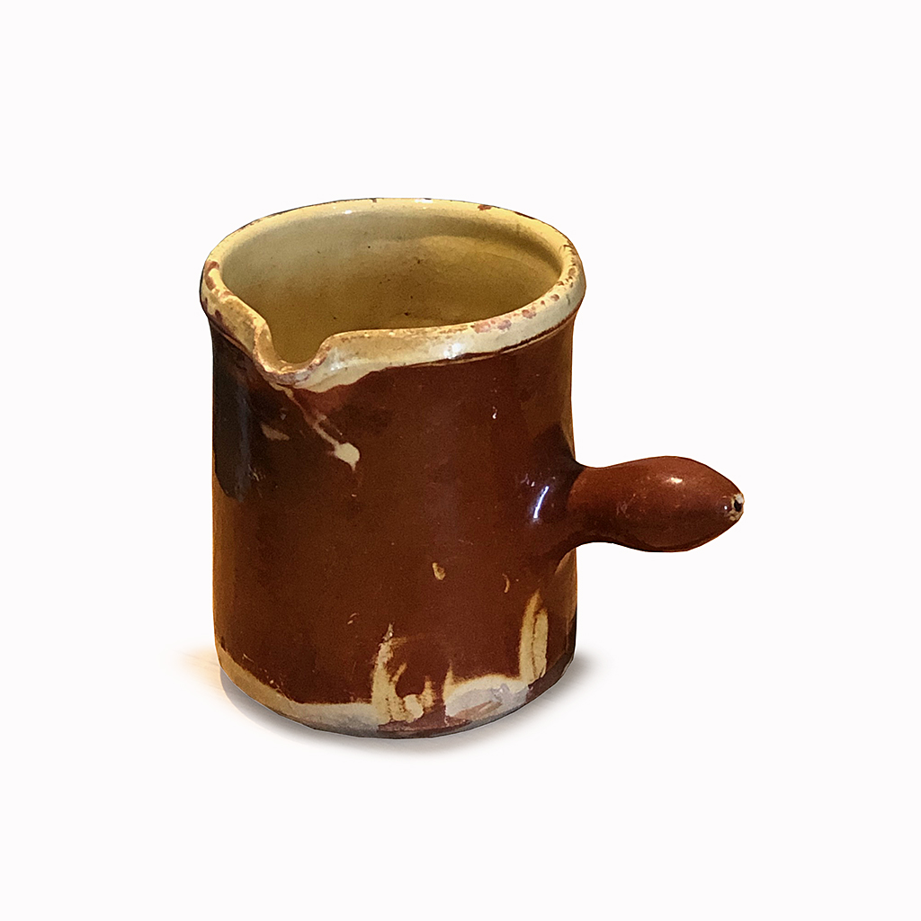 SMALL FRENCH GLAZED EARTHENWARE CHOCOLATE POT / JUG WITH SIDE HANDLE CREAM RIM 10 CM HIGH 8 CM DIAM