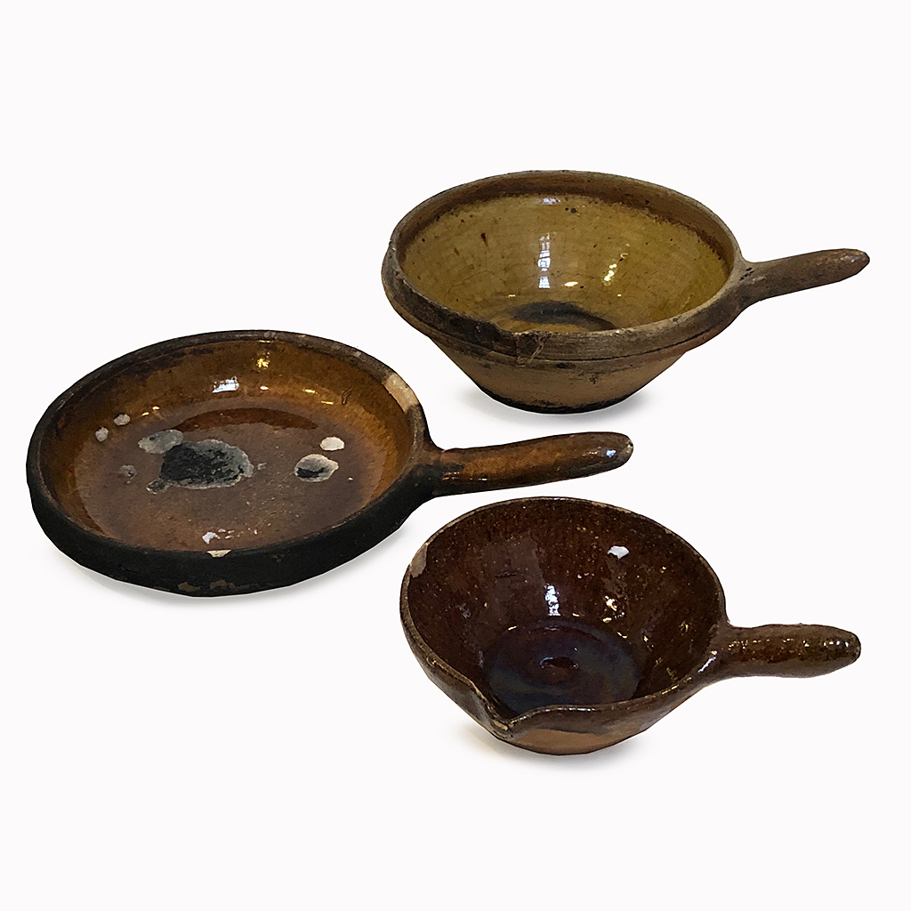 SMALL FRENCH GLAZED EARTHENWARE SKILLET PAN LIMOUSIN REGION 13 CM - 19 CM DIAM (X3)