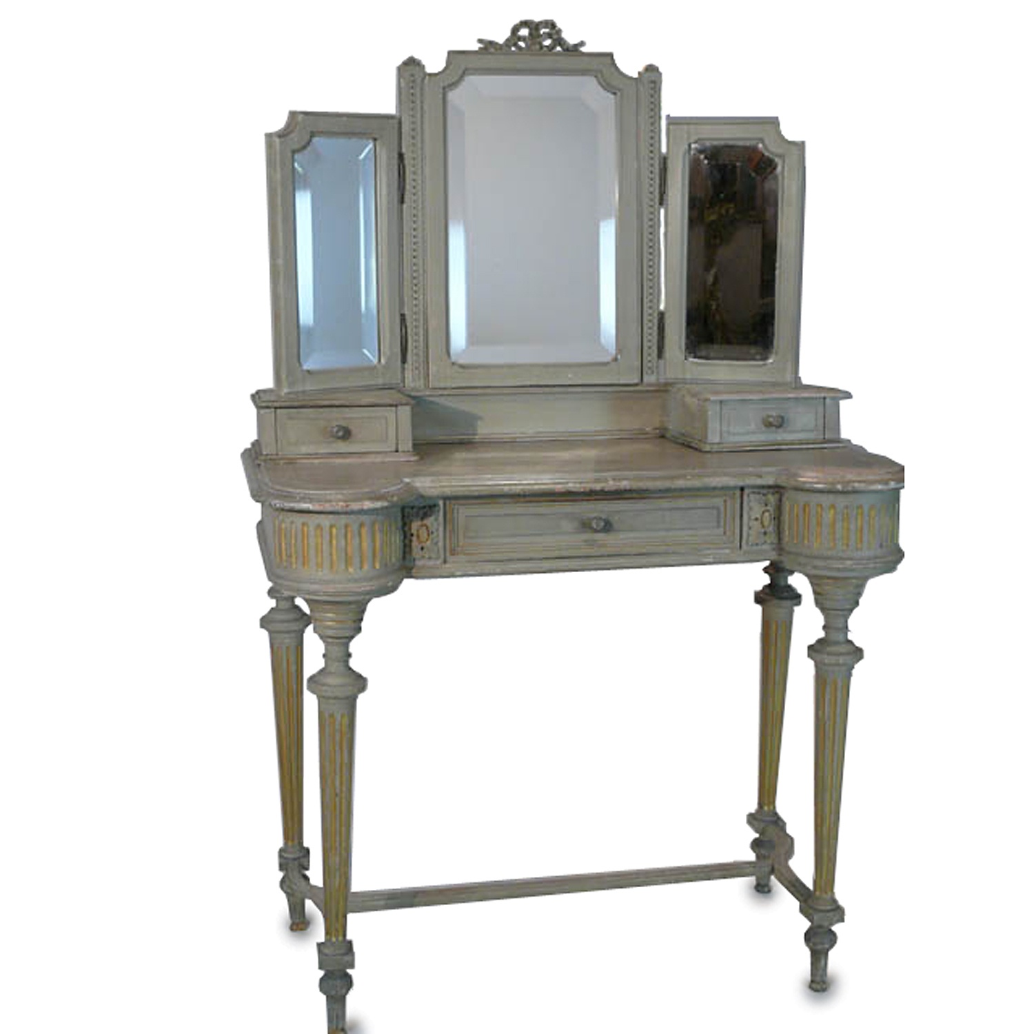 SMALL FRENCH LOUIS XVI STYLE DRESSING TABLE WITH TRIPLE MIRROR PAINTED GREY 4'7/i HIGH 3' WIDE 140 CM X 91 CM