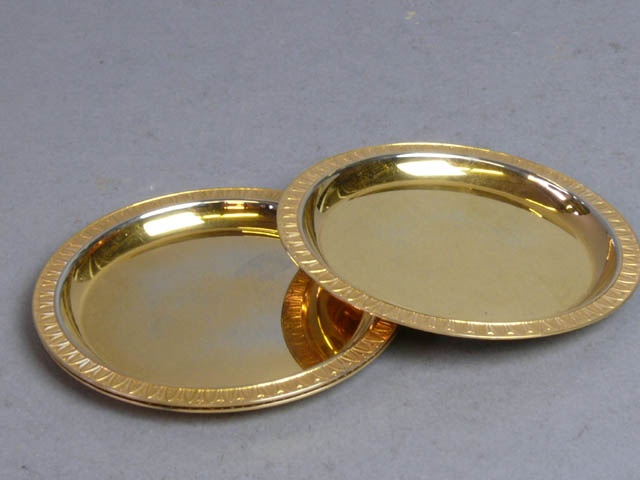 SMALL GILT METAL COASTER / DISH WITH TOUNGE BORDER 10 CM DIAM. (X3)