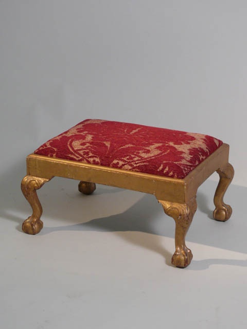 SMALL GILT WOOD FOOT STOOL RED CUT VELVET UPHOLSTERY WITH CABRIOLE LEGS 24 CM HIGH 44 CM WIDE 33 CM DEEP