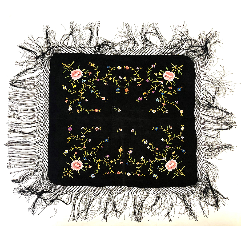 SMALL SQUARE BLACK SILK SHAWL WITH MULTICOLOURED FLORAL EMBROIDERY AND KNOTTED LONG FRINGING 2'5'' X 2'5''