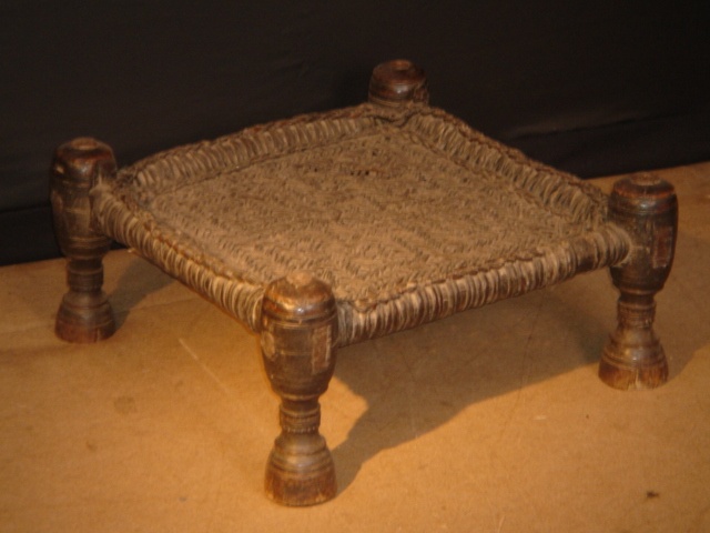 SMALL INDIAN LOW FOOTSTOOL WITH TURNED LEGS AND WOVEN LEATHER UPHOLSTERY