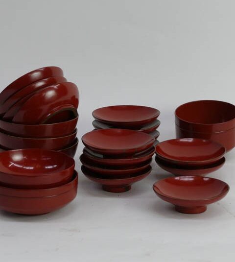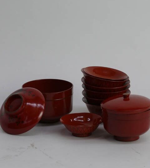 SMALL JAPANESE RED LACQUER DISH / BOWL AS SELECTED 11 CM - 13 CM DIAM. (X75)