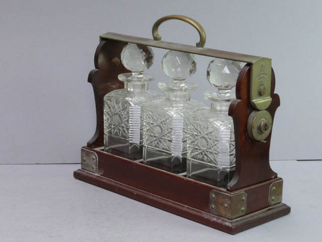 SMALL MAHOGANY AND BRASS TANTALUS COMPLETE WITH THREE SQUARE CUT GLASS SPIRIT DECANTERS