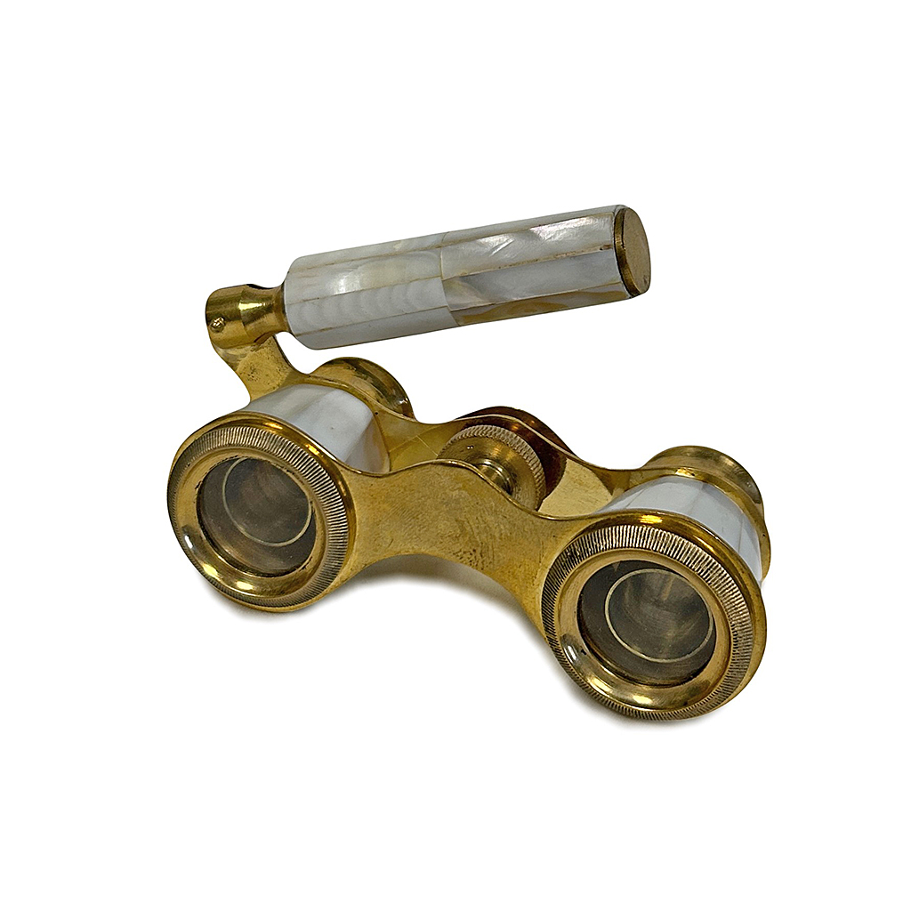 SMALL MODERN MOTHER OF PEARL AND BRASS OPERA GLASSES WITH SHORT SIDE HANDLE 10 CM WIDE / 4.5 CM DEEP