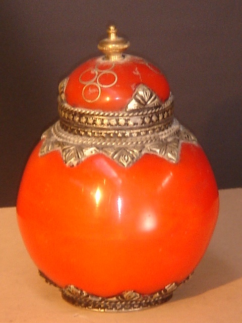 SMALL MOROCCAN RUBY STONE VASE WITH SILVER MOUNTS AND LID SPHERICAL FORM