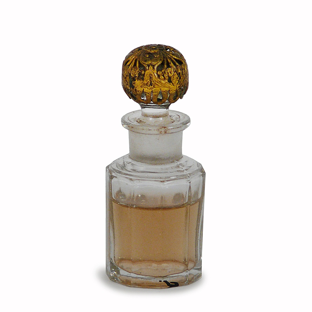 SMALL MOULDED GLASS SCENT BOTTLE WITH GILT FILIGREE DECORATED STOPPER