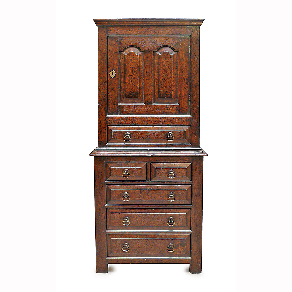 SMALL OAK GEORGIAN STYLE CUPBOARD ON CHEST WITH SIX DRAWERS 141 CM HIGH 61 CM WIDE 46 CM DEEP