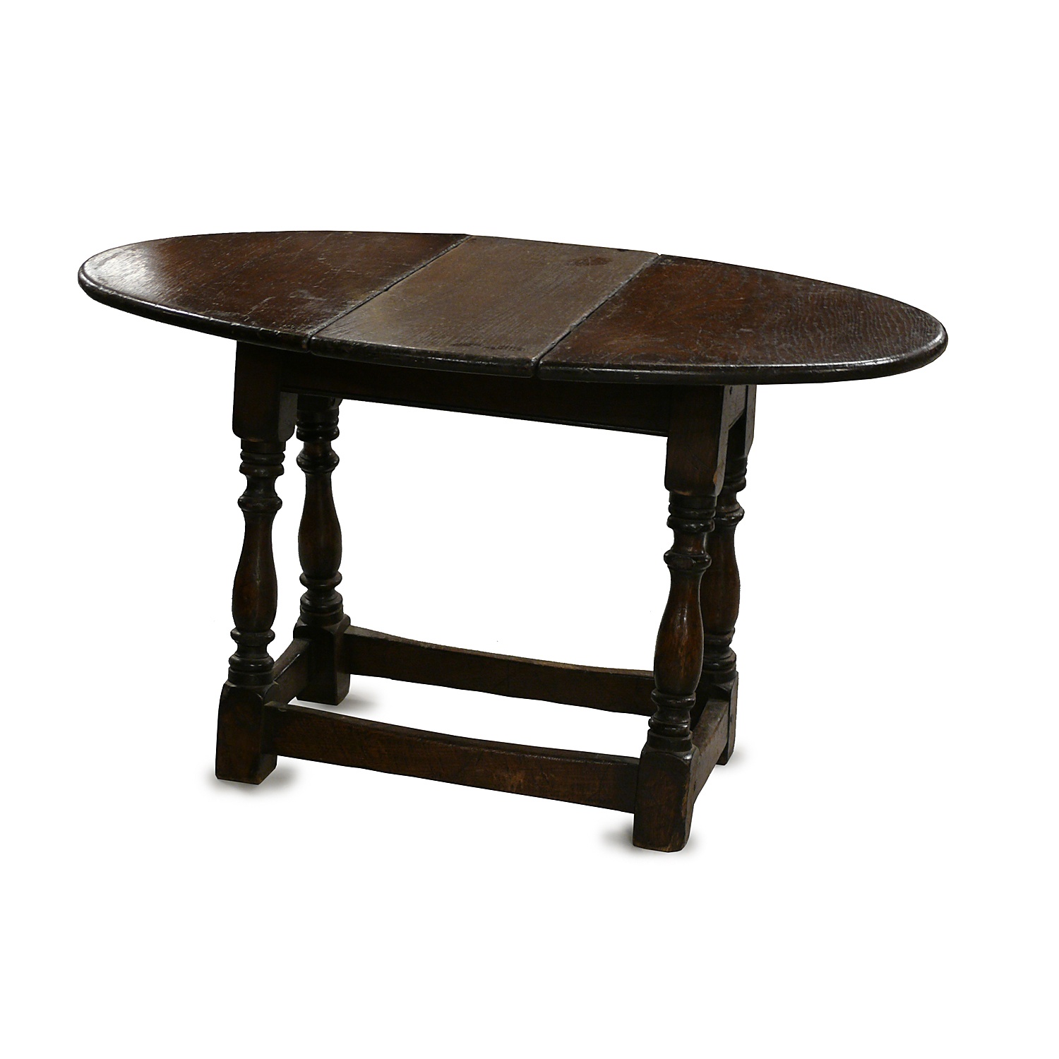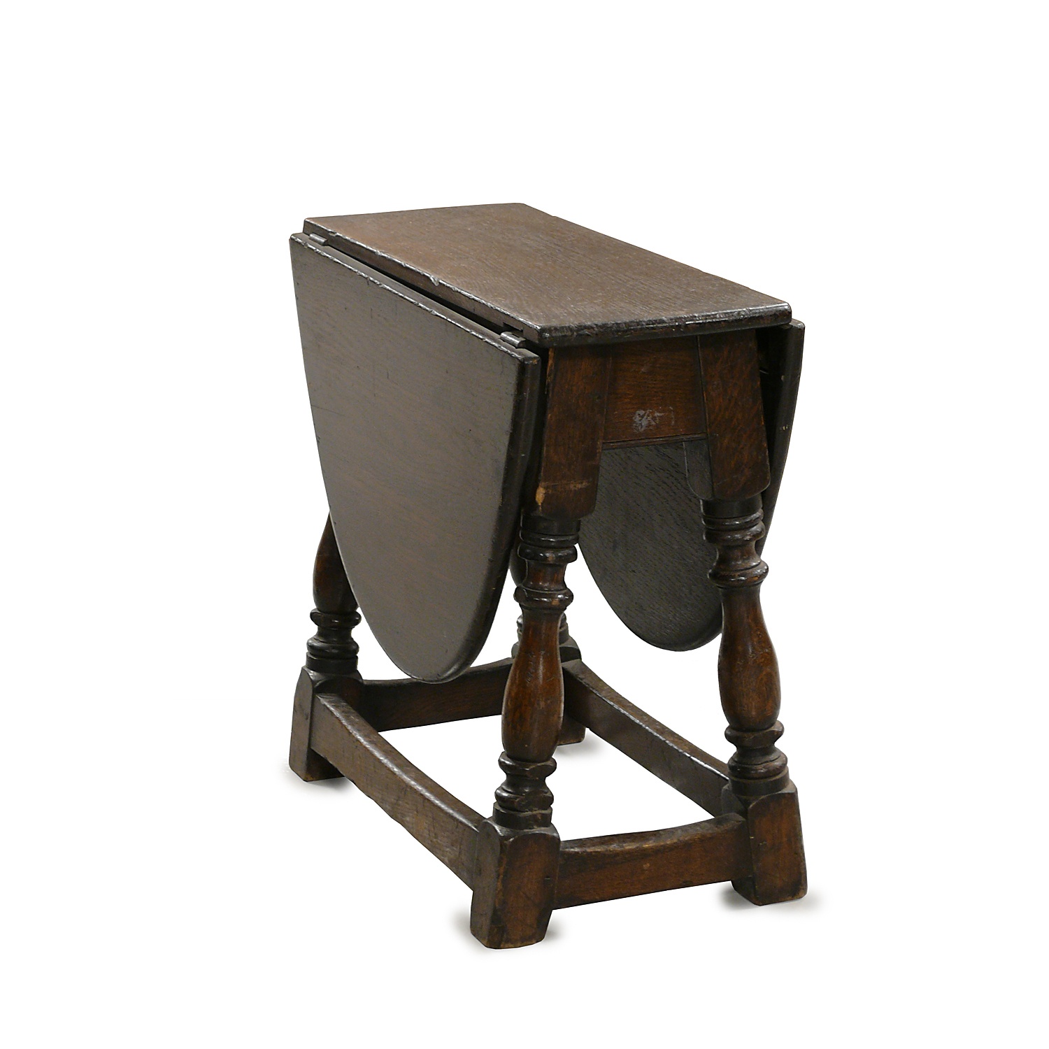SMALL OVAL OAK DROP LEAF TABLE / STOOL WITH TURNED LEGS CHARLES II STYLE 46 CM HIGH 50 CM WIDE 22 CM LONG (CLOSED) 79 CM (OPEN)