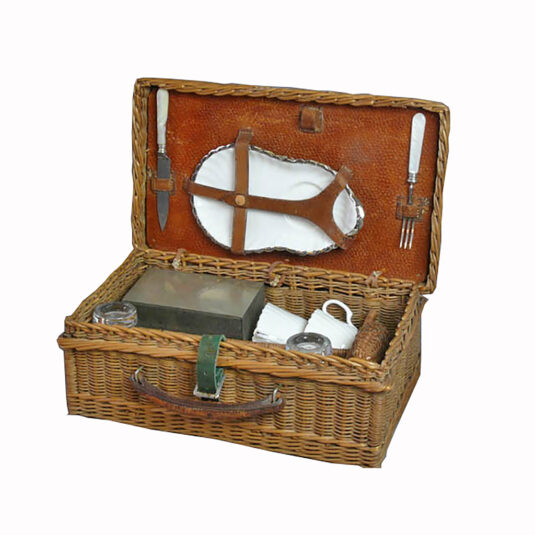 SMALL PICNIC HAMPER CANE VICTORIAN / EDWARDIAN COMPLETE FITTED WITH 11 PIECES INC. TENNIS PLATES
