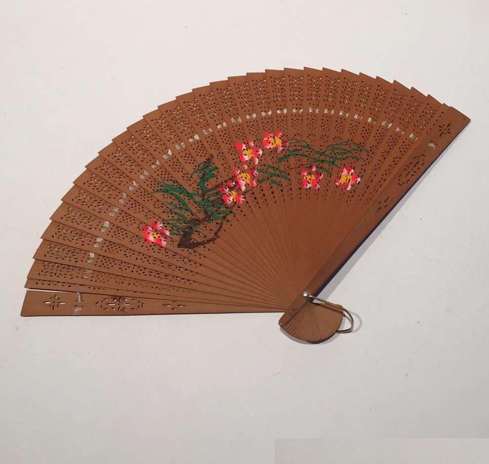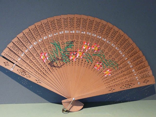 SMALL PIERCED SANDLEWOOD FRETWORK FAN WITH PAINTED DETAIL
