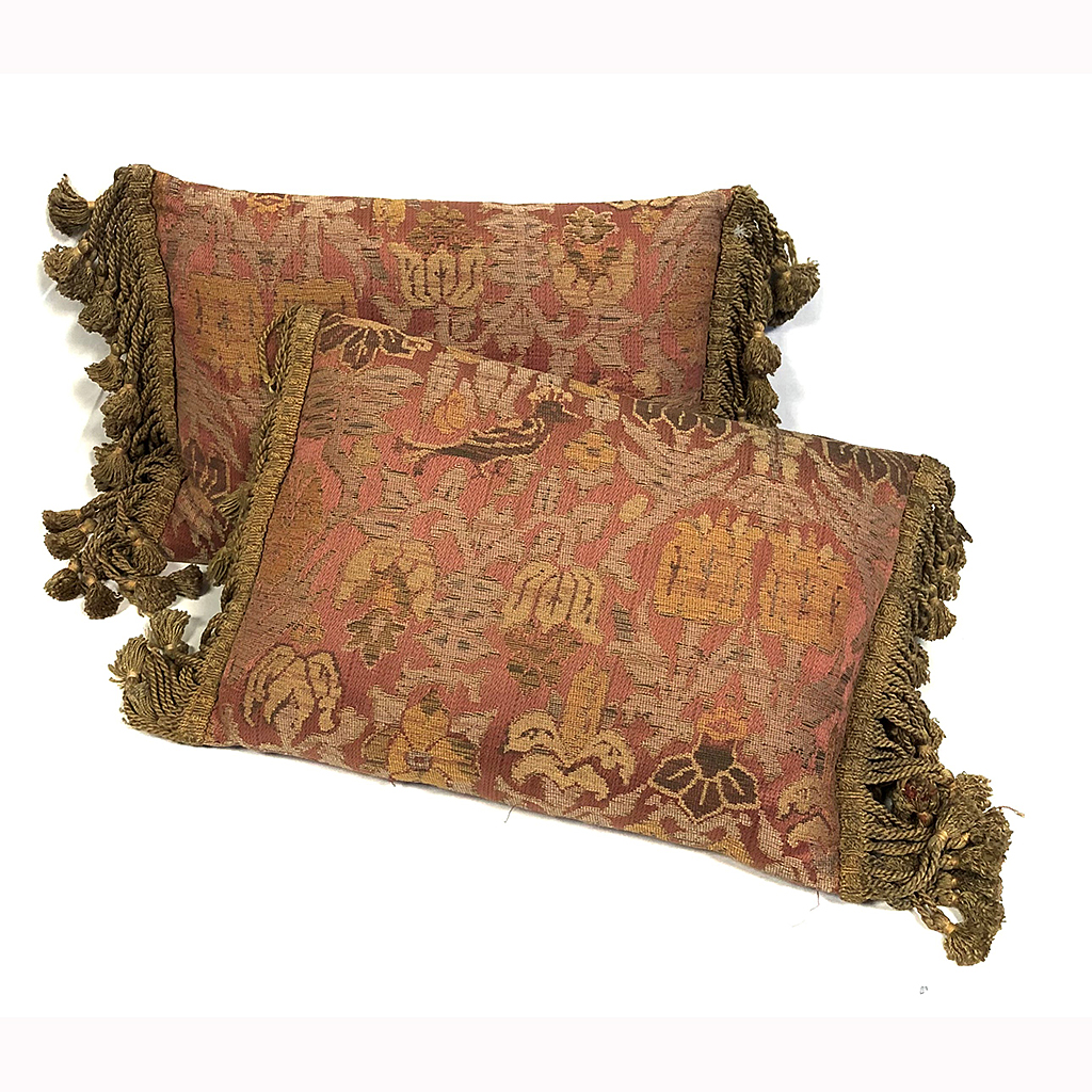 SMALL RED OBLONG DAMASK CUSHION WITH EDGE BRAID AND TASSEL FRINGE 40 CM X 29 CM