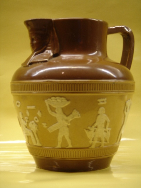 SMALL ROYAL DOULTON JUG EGYPTIAN REVIVAL LAMBETH WARE BROWN AND CREAM STONE GLAZE 14 CM HIGH