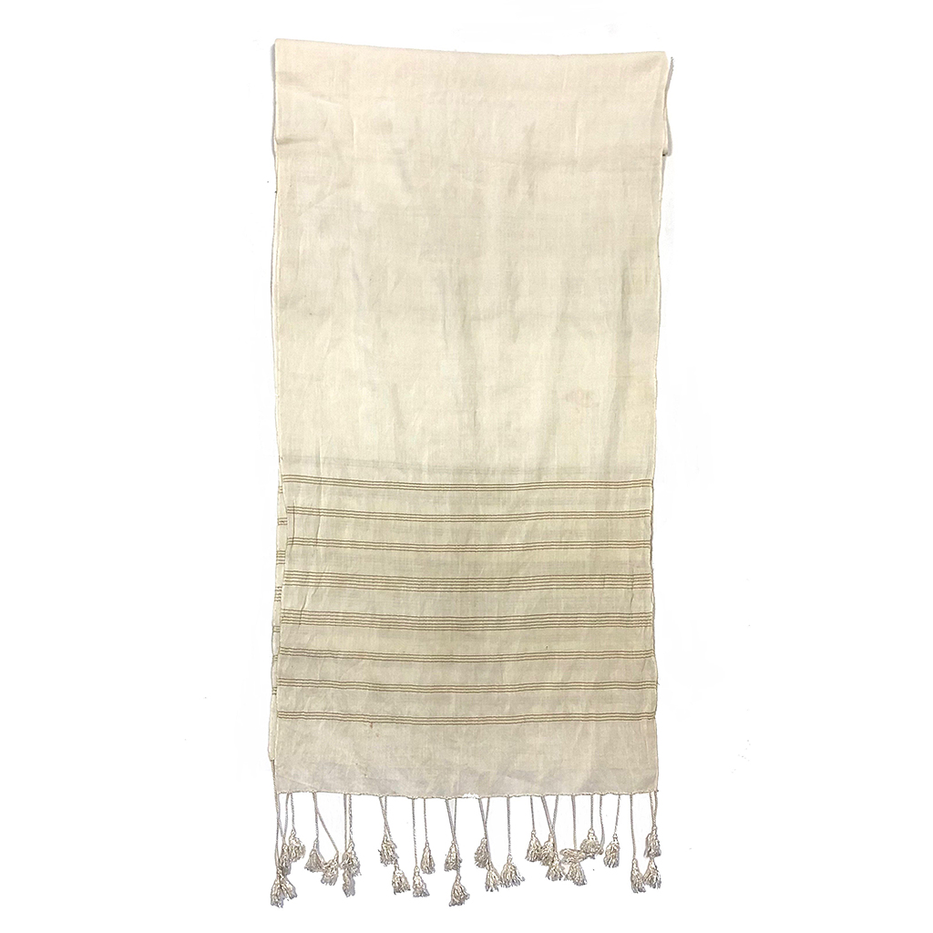 SILK SHAWL / STOLE CREAM WITH STRIPE DECORATION AND TASSEL FRINGING 9'5'' LONG / 1'5'' WIDE