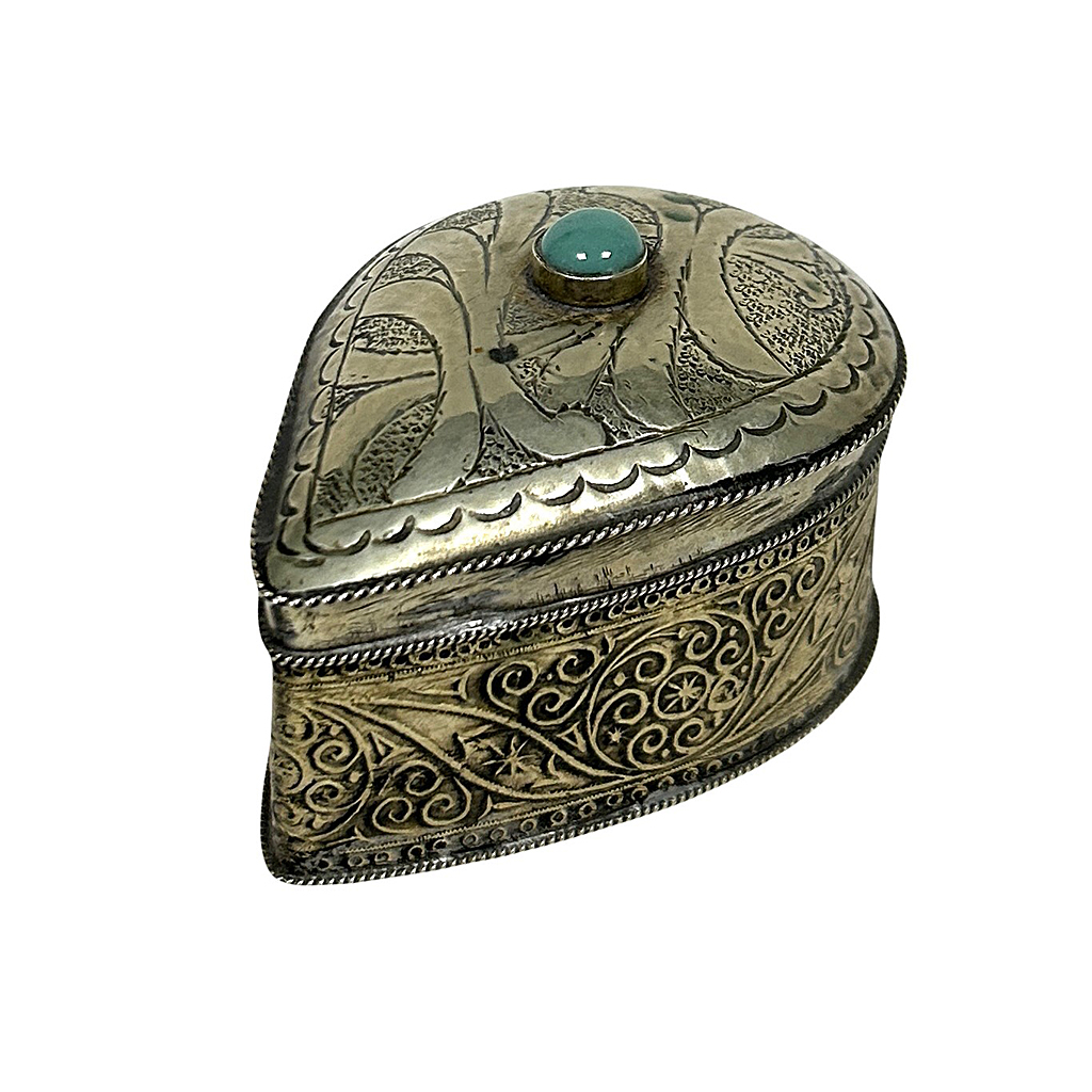 SMALL SILVER DROP SHAPE BOX WITH ENGRAVED DECORATION AND HINGED LID WITH TURQUOISE STONE 9 CM LONG / 6 CM WIDE / 5 CM HIGH