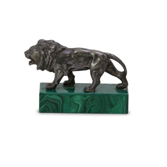 SMALL SILVER LION ON GREEN MALACHITE BASE 8 CM HIGH 11 CM LONG
