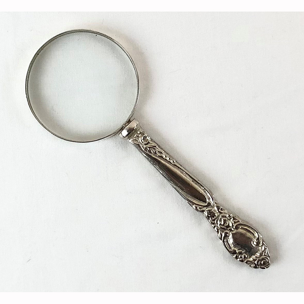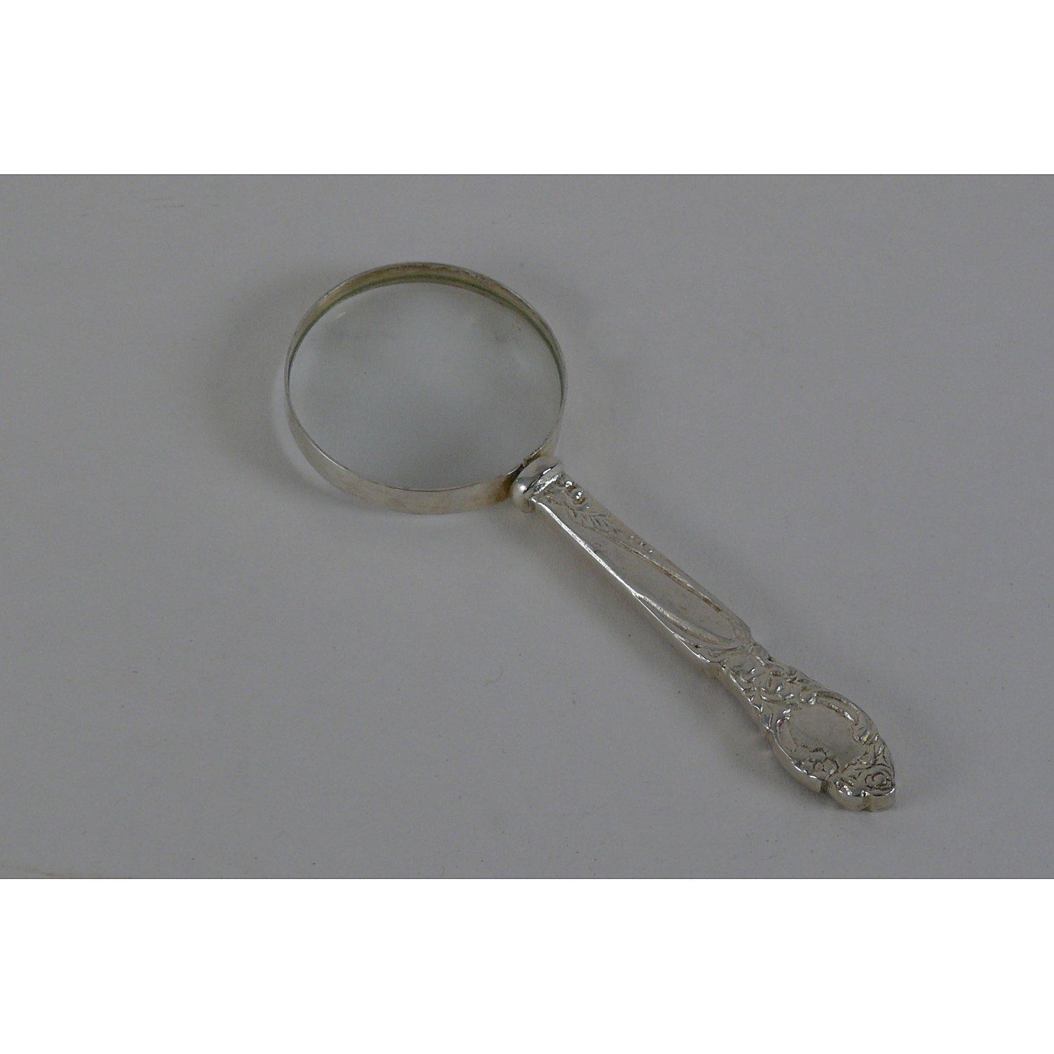 SMALL SILVER PLATED MAGNIFYING GLASS WITH FLORAL DECORATED HANDLE
