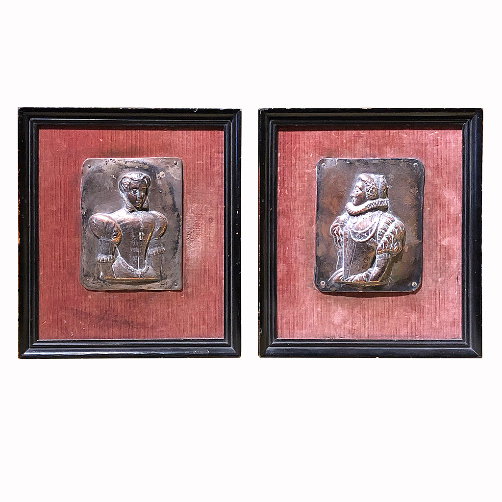 SMALL SILVER RELIEF PLAQUE PORTRAIT PICTURE OF ELIZABETH I / MARY QUEEN OF SCOTTS ON FADED PINK VELVET MOUNT WITH EBONY FRAME 22 CM HIGH 20 CM WIDE