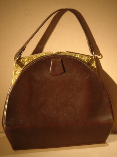 SMALL TAN LEATHER GILT METAL HANDBAG 21 CM WIDE