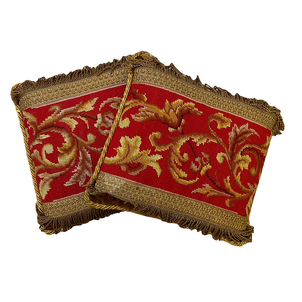 SMALL TERRACOTTA / GOLD TAPESTRY DAMASK CUSHION WITH BRAID FRINGE DECORATION 33 CM X 27 CM