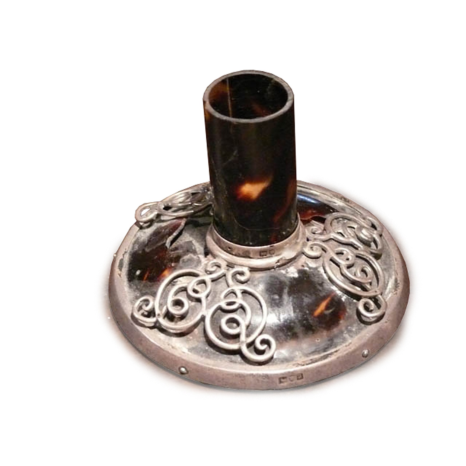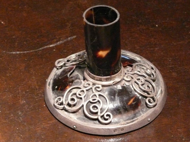 SMALL TORTOISESHELL AND SILVER MOUNTED CANDLESTICK ( FROM SET )