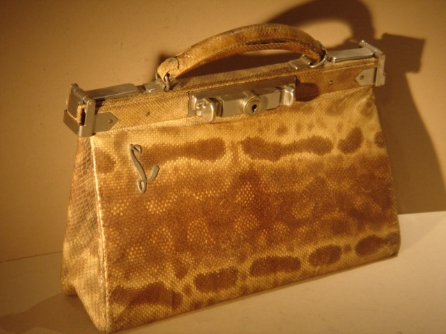 SMALL VINTAGE SNAKESKIN HANDBAG GLADSTONE SYLE WITH GILT L MONOGRAME 25 CM WIDE