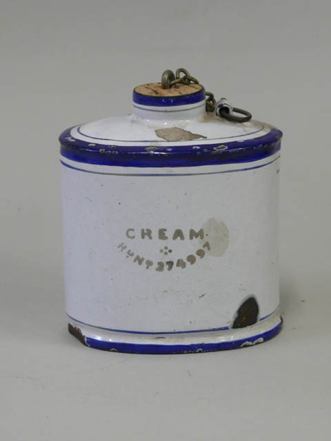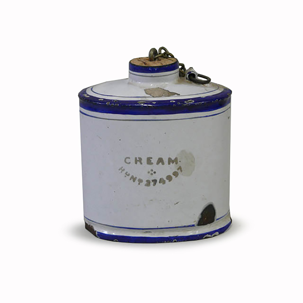 SMALL WHITE ENAMEL BILLY CAN WITH CORK STOPPER