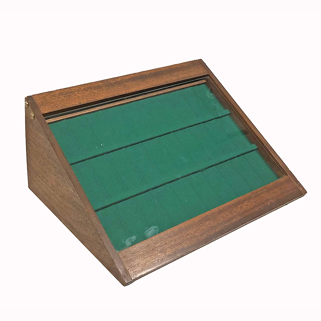 SMALL WOODEN SLOPED / ANGLED COUNTER DISPLAY CASE WITH GREEN BAIZE TRAY